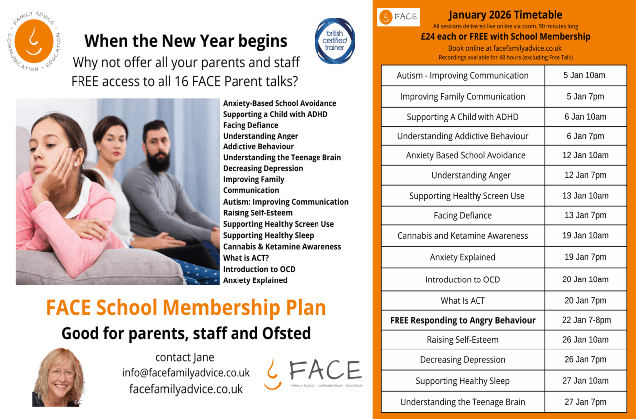 This can be used by any parents or staff from our school for unlimited access to all the regular FACE Parent Talks (usually £24 each). The code cannot be used on any other FACE services and must not be shared with parents or staff from other schools.