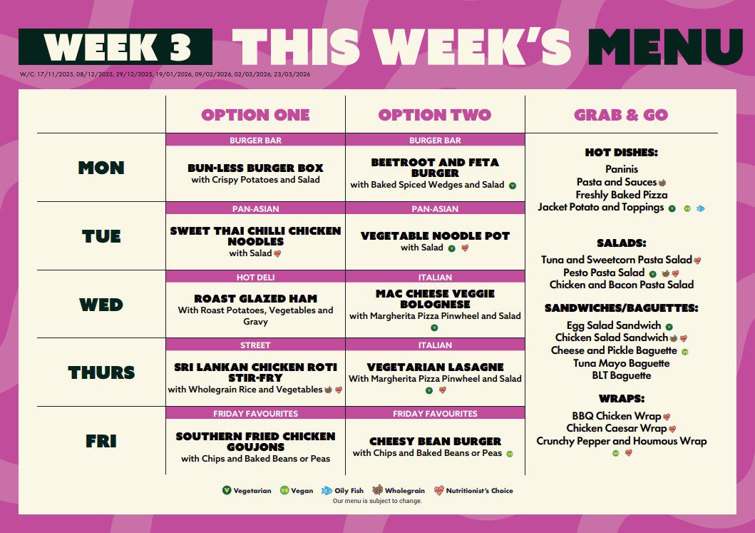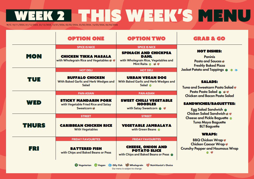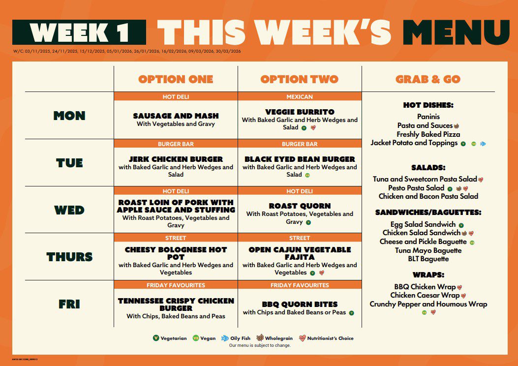 - Main Dining Hall serves a hot meal of the day (meal deal with pudding and drink), along with a vegetarian option. There is also a Deli Bar that offers a variety of freshly made sandwiches and baguettes, salad, pasta, pizza and jacket potatoes with fillings and a variety of homemade cakes and biscuits.